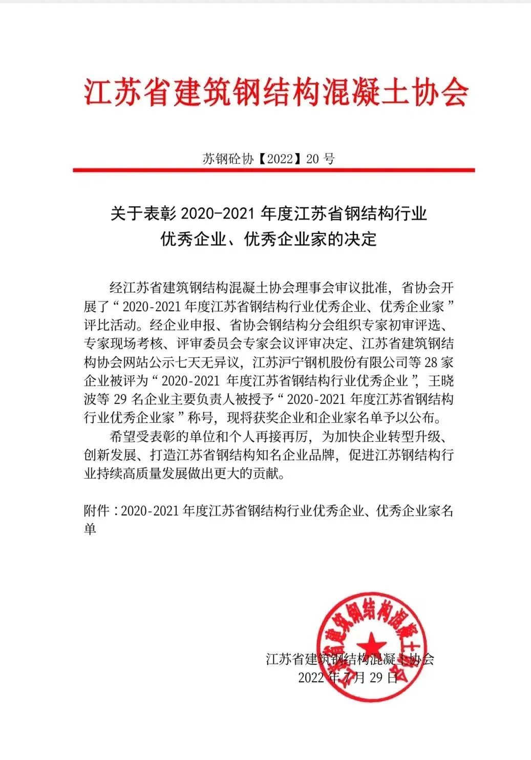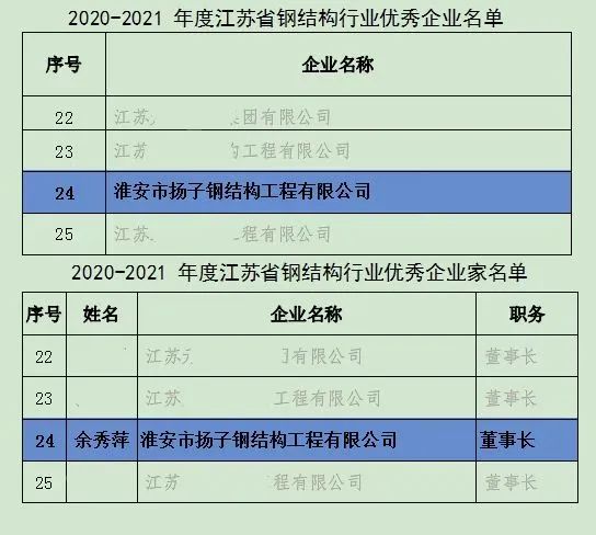 七月的驕陽熱情似火,七月的花海流溢飄香?;窗彩袚P(yáng)子鋼結(jié)構(gòu)工程有限公司(以下簡稱“揚(yáng)子鋼構(gòu)”)全體員工懷著無比激動的心情,迎來了盼望已久的喜訊——淮安揚(yáng)子鋼構(gòu)被江蘇省建筑鋼結(jié)構(gòu)混凝土協(xié)會評為“2020-2021年度江蘇省鋼結(jié)構(gòu)行業(yè)優(yōu)秀企業(yè)”,董事長余秀萍被授予“2020-2021年度江蘇省鋼結(jié)構(gòu)行業(yè)優(yōu)秀企業(yè)家”稱號。