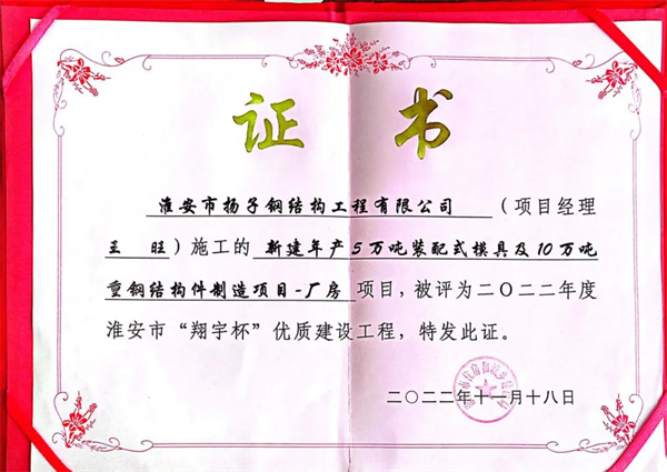 近日,省住房和城鄉(xiāng)建設(shè)廳公布了2022年度江蘇省優(yōu)質(zhì)工程獎(jiǎng)“揚(yáng)子杯”獲獎(jiǎng)項(xiàng)目名單?;窗彩袚P(yáng)子鋼結(jié)構(gòu)工程有限公司(以下簡(jiǎn)稱“揚(yáng)子鋼構(gòu)”)承建的“新建年產(chǎn)5萬噸裝配式模具及10萬噸重鋼結(jié)構(gòu)構(gòu)件制造項(xiàng)目-廠房”項(xiàng)目名列其中。