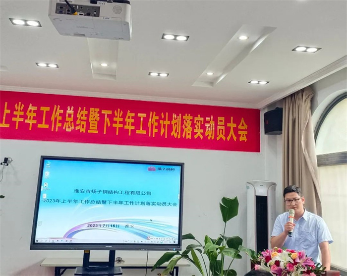 7月15日,淮安市揚(yáng)子鋼結(jié)構(gòu)工程有限公司(以下簡稱“揚(yáng)子鋼構(gòu)”)召開了2023年上半年工作總結(jié)暨下半年工作計(jì)劃落實(shí)動(dòng)員大會。公司全體管理人員參加了會議,會議由人資行政部張偉主持。