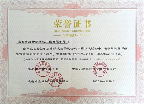 近日,淮安市揚子鋼結(jié)構(gòu)工程有限公司(以下簡稱“揚子鋼構(gòu)”)在2022年度市級誠信示范企業(yè)申報認定活動中,榮獲第三屆“淮安市誠信示范企業(yè)”稱號。