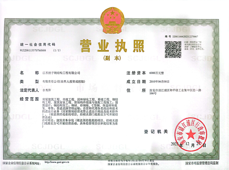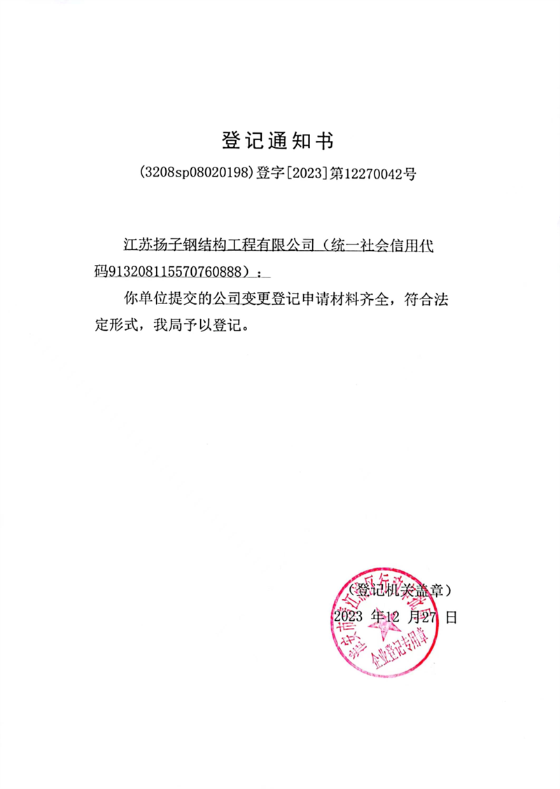 因公司發(fā)展需要,經(jīng)淮安市清江浦區(qū)市場(chǎng)監(jiān)督管理局核準(zhǔn),自2023年12月27日起,我司“淮安市揚(yáng)子鋼結(jié)構(gòu)工程有限公司”名稱正式變更為“江蘇揚(yáng)子鋼結(jié)構(gòu)工程有限公司”。我公司將從即日起,啟用核準(zhǔn)后的公司名稱。