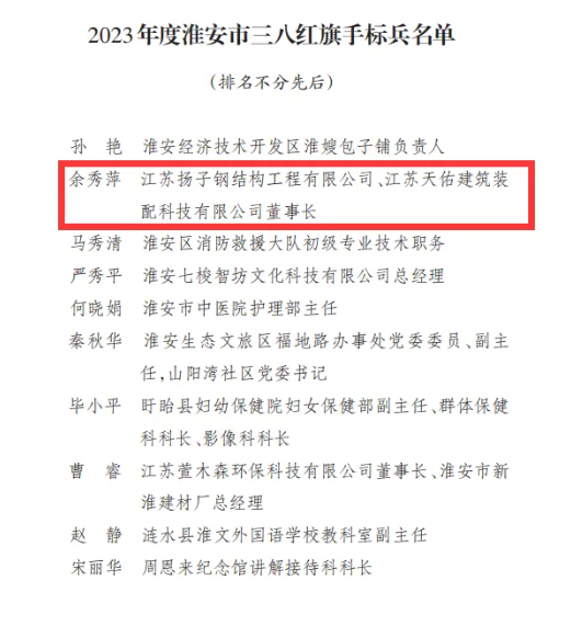 日前,淮安市婦聯(lián)發(fā)布《關(guān)于表彰淮安市三八紅旗手標(biāo)兵、三八紅旗手(集體)的通報(bào)》,江蘇揚(yáng)子鋼結(jié)構(gòu)工程有限公司、江蘇天佑建筑裝配科技有限公司董事長(zhǎng)余秀萍獲“淮安市三八紅旗手”榮譽(yù)稱號(hào)。