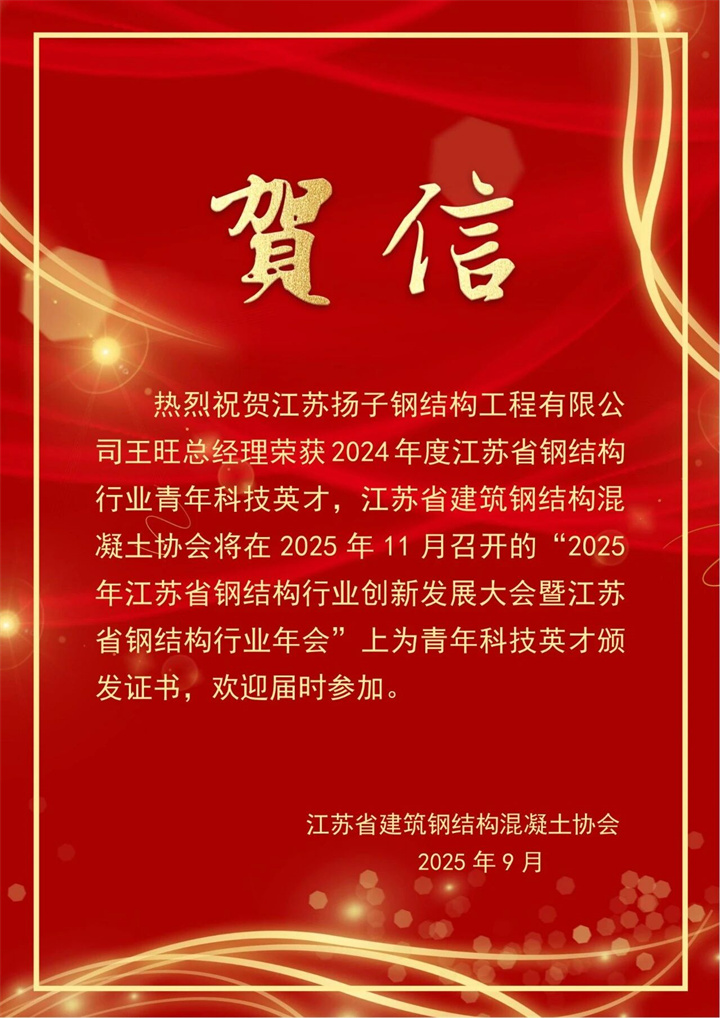 熱烈慶祝我司榮獲2023-2024年度江蘇省鋼結構協(xié)會優(yōu)秀企業(yè),我司余秀萍董事長榮獲省鋼結構行業(yè)優(yōu)秀企業(yè)家,我司王旺總經理榮獲省鋼結構行業(yè)青年科技英才。這不僅是公司的榮譽,更是揚子每位員工的驕傲,期待未來繼續(xù)并肩前行,再創(chuàng)佳績,續(xù)寫更多精彩。